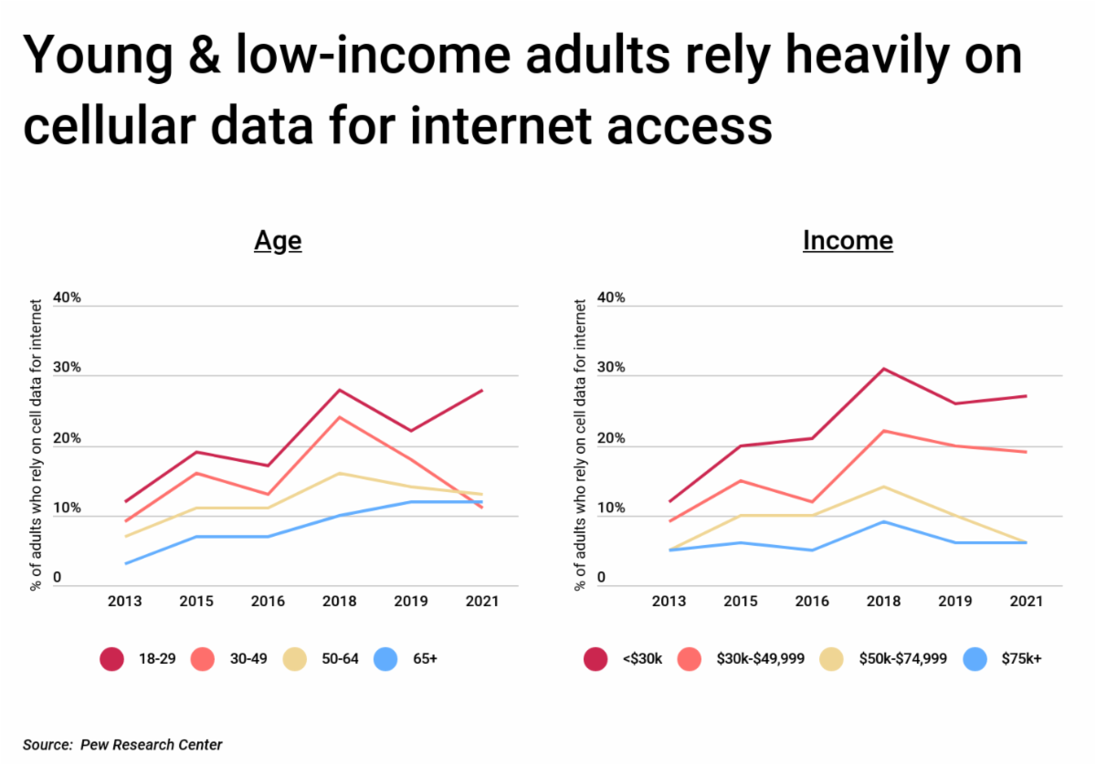 But internet access is more frequently limited by household resources. Those with lower incomes tend to have a difficult time accessing the internet either because service is unaffordable or their communities do not have the same infrastructure available in wealthier, more developed areas. Households earning under $30,000 per year are much likelier than higher-earning households to rely on cellular data for internet access, with 27% of such households reporting doing so.