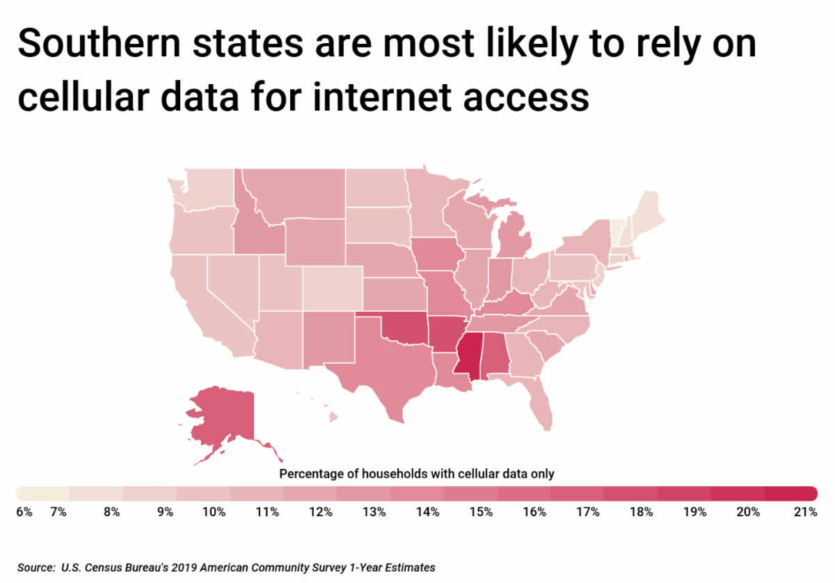 Many of the locations most likely to benefit from these investments are rural states with lower household incomes, where internet infrastructure is unavailable or residents are unable to afford costs. The states with the highest reliance on cellular data for internet access are primarily located in the South, led by Mississippi at 20.1 percent, Arkansas at 17.4 percent, and Oklahoma at 17.1 percent. These are also among the states where residents are least likely to have any internet access at all.