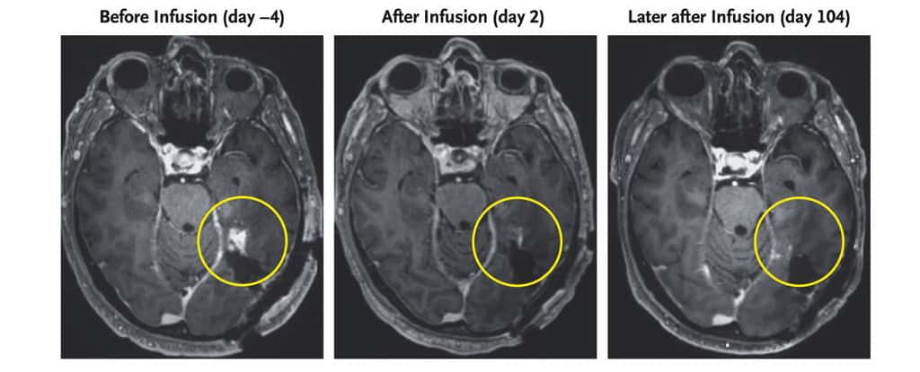 It was a similar story for a 57 year old woman with a sizable glioblastoma growing in her left hemisphere. Though her tumor saw a near complete regression five days after the therapy, the cancer showed signs of bouncing back just a month later.