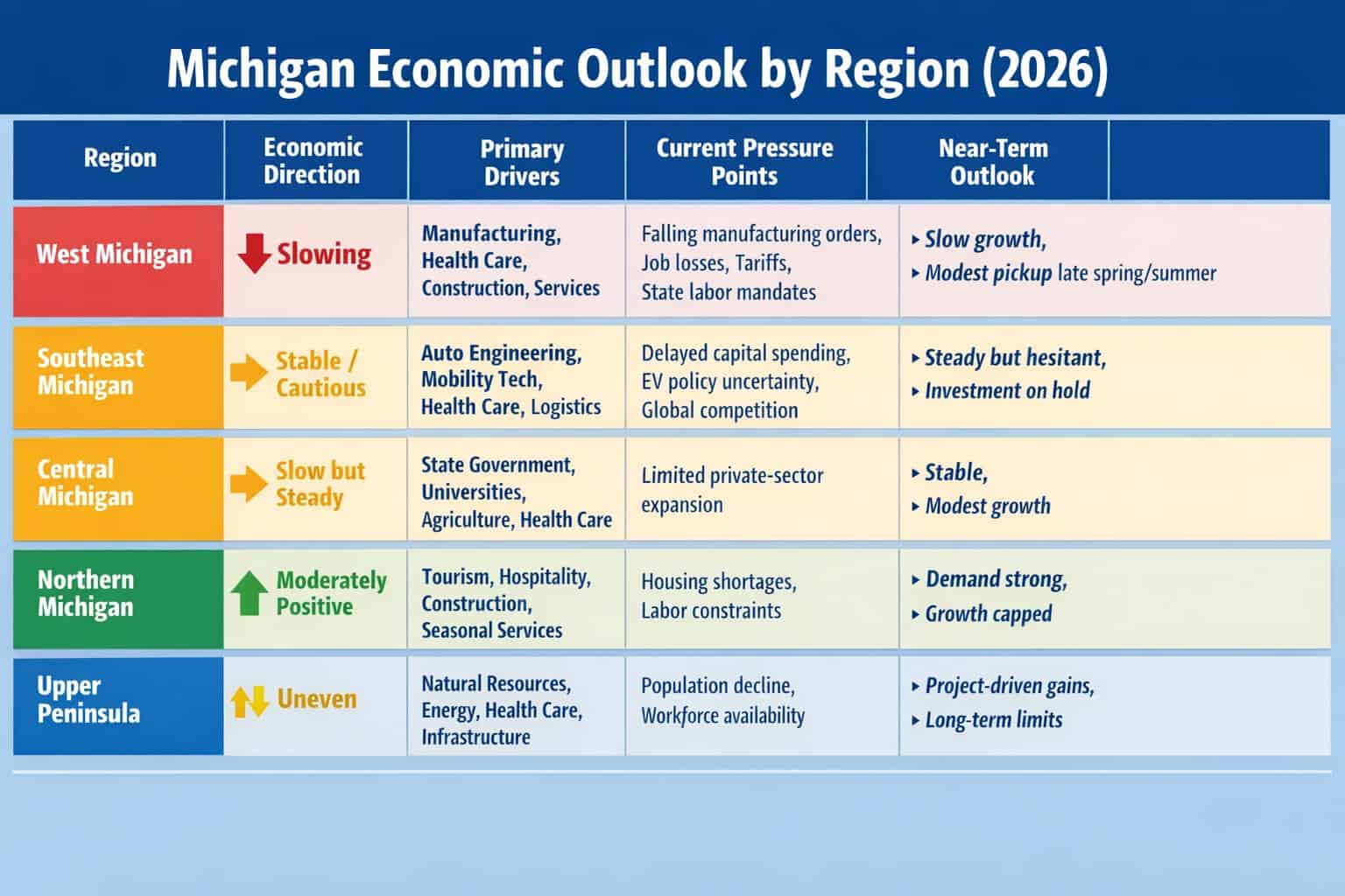 Across Michigan, the message is consistent but uneven: growth is slowing, not stopping — and the regions best positioned to adapt will be those with diversified economies, access to capital and the ability to navigate policy uncertainty without freezing investment.