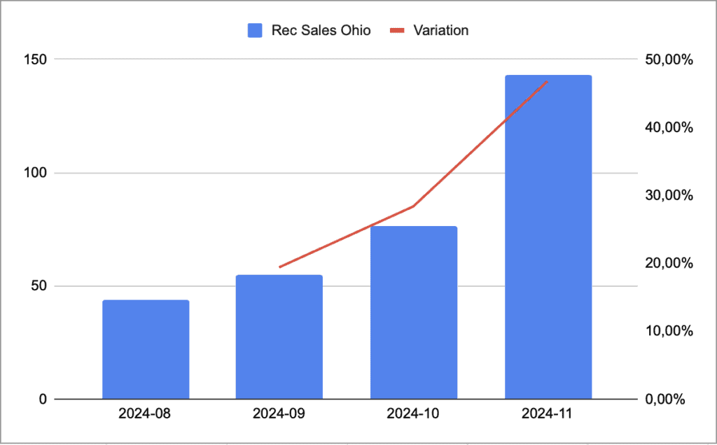 September 2024 recorded nearly $54.7 million, while October sales surged to $76.3 million. By November, cumulative sales reached $143 million, underscoring the market’s exponential growth. Growth between October and November reached an astonishing 47%.