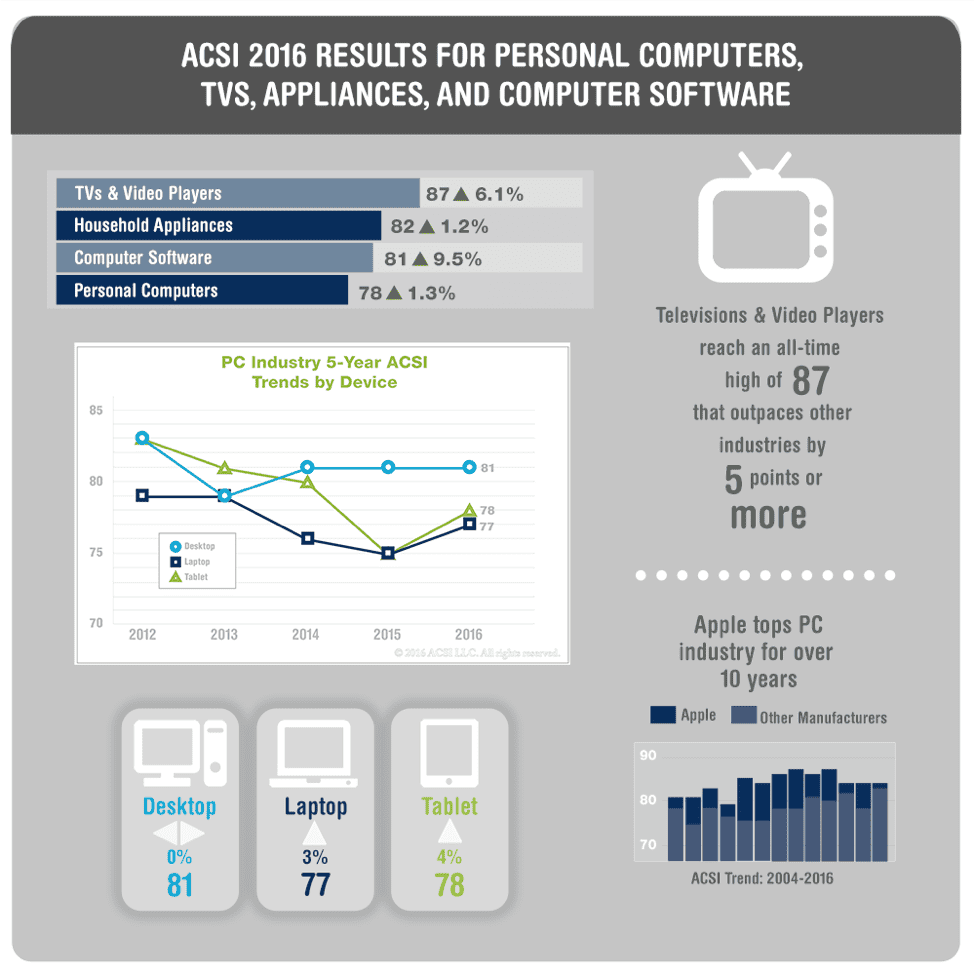 The ACSI Household Appliance and Electronics Report 2016 includes desktops, laptops, and tablet computers, as well as household appliances, televisions and computer software.